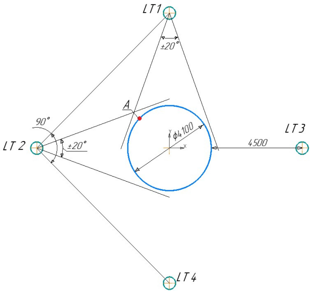 В данном разделе будет рассмотрен выбор параметров измерительной системы для многопозиционного контроля крупногабаритной обечайки. При этом стоянки трекера должны являться вершинами воображаемого квадрата. Располагаться они должны на одном расстоянии от обечайки. Зная оптимальный диапазон углов измерения [6], можно определить расстояние от стоянок трекера до обечайки.