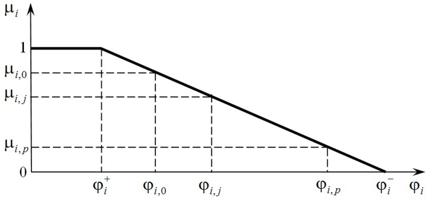 Введенные локальные критерии φ1 и φ2 имеют различный технико-экономический смысл и задаются с помощью различных единиц измерения. Большинство методов многокритериальных задач оптимизации требуют перехода к безразмерным нормализованным аналогам критериев. В настоящей работе применен метод нормализации, описанный в [11] и модернизированный в работах [12, 13]. Этот метод основан на введении некоторых границ в области изменения каждого критерия, задаваемых в результате анализа значений, которые принимаются заданными альтернативами с учетом предпочтений лица, принимающего решение (ЛПР).
