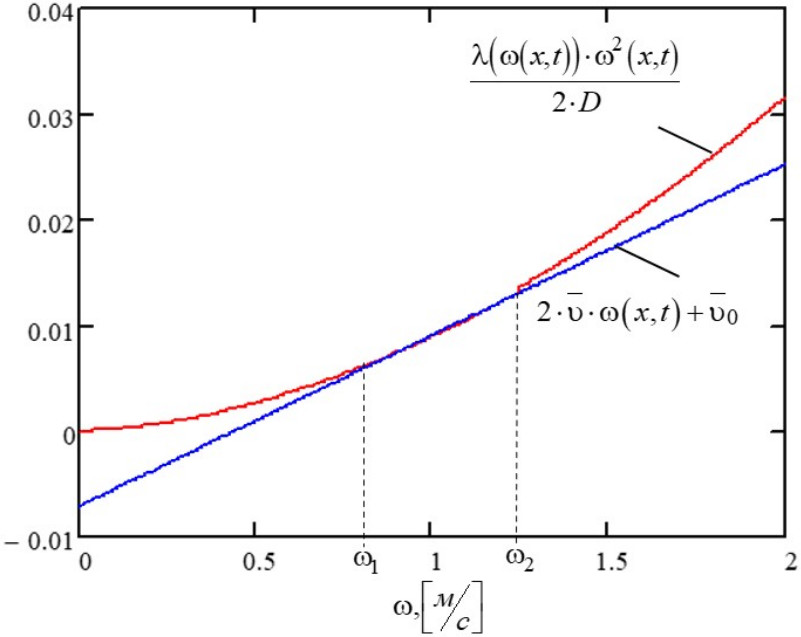 Схема выбора коэффициентов линеаризации (см. рис. 1) содержит две точки пересечения прямой и исходной нелинейной зависимости , которая может быть построена по формулам гидравлических сопротивлений для зоны гидравлически гладких труб и зоны смешанного трения турбулентного режима течения [15], характерных для большинства режимов транспортировки нефти и нефтепродуктов.