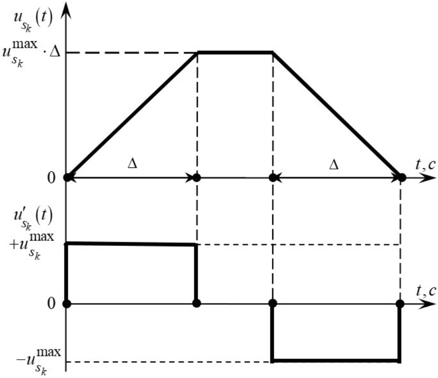 В качестве типовой программы пуска (останова) насосного агрегата может рассматриваться программа с постоянной скоростью роста () или снижения () перепада давления на насосе, приведенная в [5], функциональная зависимость от времени которой имеет вид