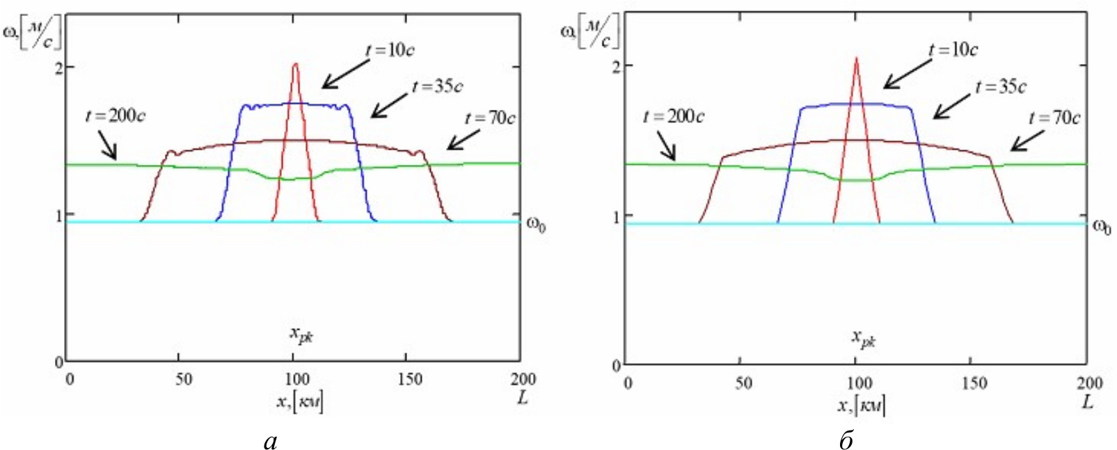 Рис. 3. Распределение скорости потока по длине трубопровода в различные моменты времени: а – численное решение; б – аналитическое решение