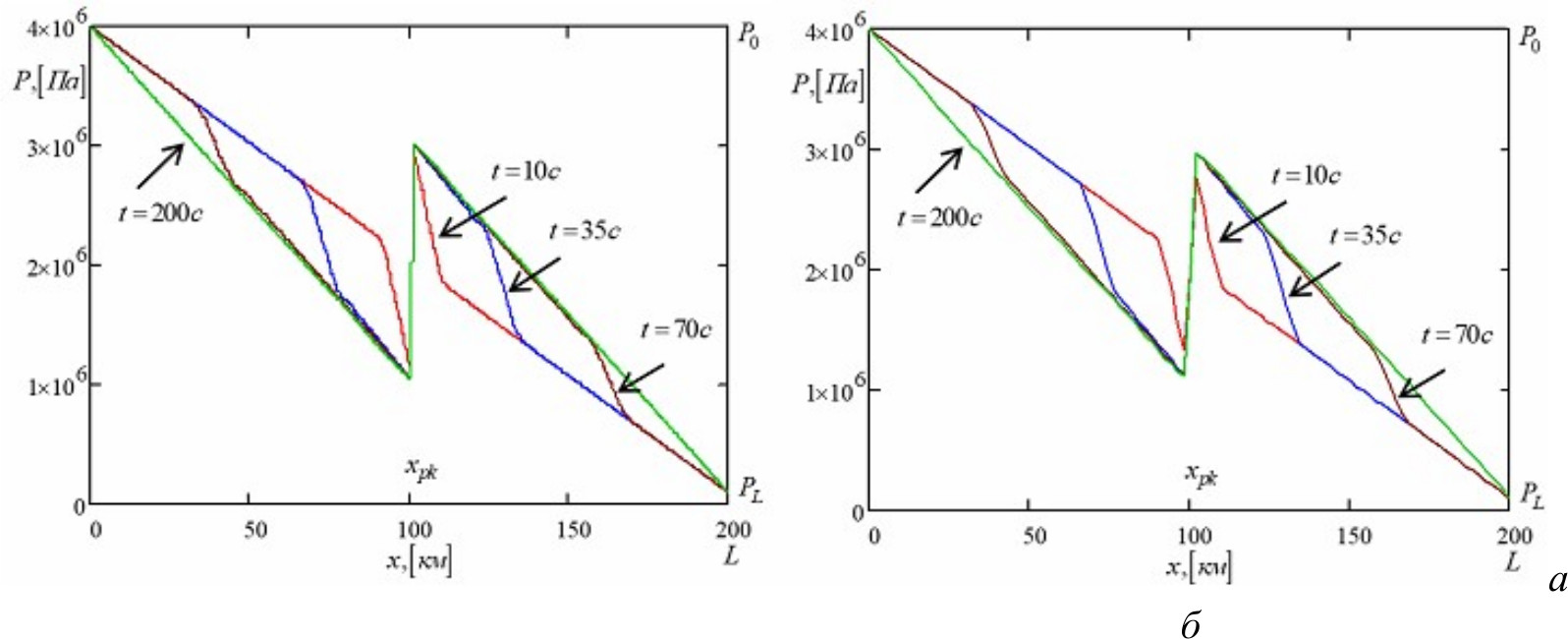 Рис. 4. Распределение давления по длине трубопровода в различные моменты времени: а – численное решение; б – аналитическое решение