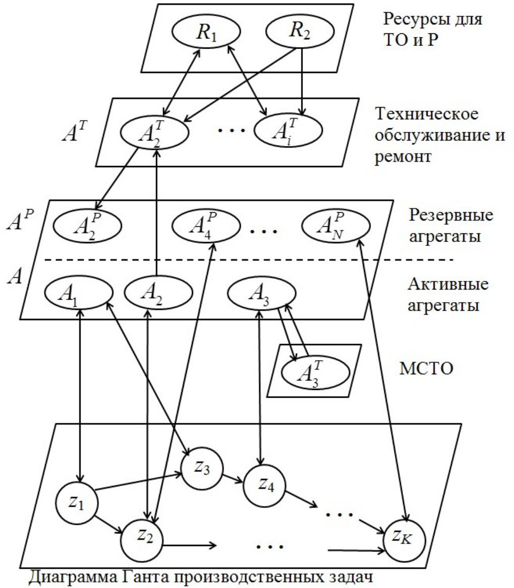 Для многих приложений вид иерархической сети Петри для моделирования ТОиР имеет общую структуру, которая показана на рис. 3. На верхнем уровне находятся модели агрегатов или объектов в виде «цифровых двойников», которые описывают внутреннюю динамику функционирования. На этом же уровне реализуется модуль, связывающий график производственного или технологического процесса с назначением конкретных агрегатов определенным задачам в заданные периоды времени. На этом этапе могут использоваться методы дискретной оптимизации для решения задачи о назначениях. Пример использования оптимизационно-имитационного подхода для решения аналогичной проблемы приведен в работе [22]. В результате получаем распределение активных агрегатов по задачам и формирование множества резервных агрегатов.