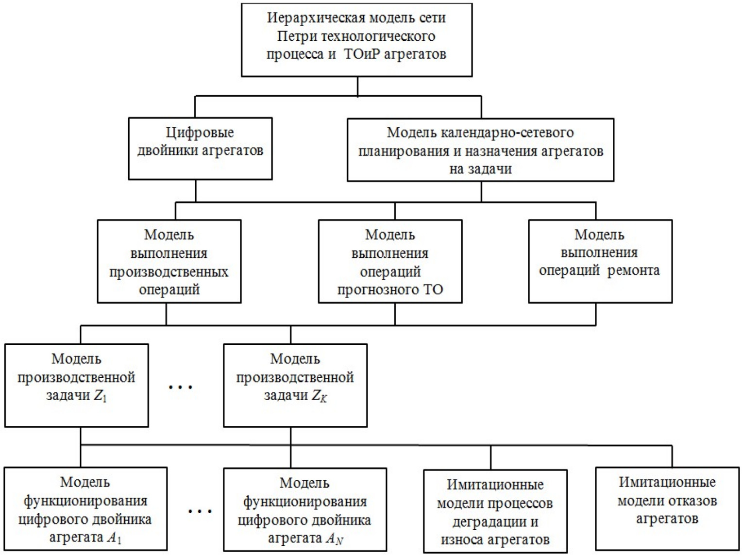 На следующих уровнях формируются имитационные модели Петри по каждой производственной операции, а также для операций технического обслуживания и ремонта. Нижний уровень иерархии содержит детальные модели цифровых двойников с помощью представления цветных позиций сети Петри в виде совокупности мультимножеств узлов и агрегатов.