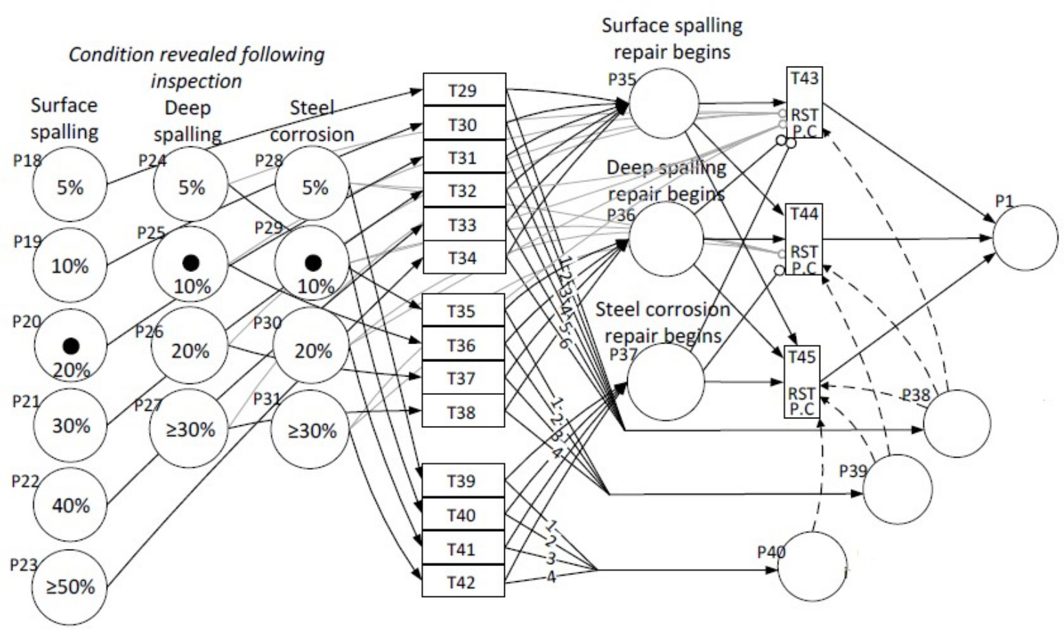 Три группы позиций Р18–Р23, Р24–Р27 и Р28–Р31 соответствуют определенным состояниям настила моста. На рис. 5 показана ситуация, когда при осмотре моста обнаруживается 20 % поверхностного выкрашивания (позиция Р20), 10 % глубоких сколов (позиция Р25) и 10 % коррозии арматурной стали (позиция Р29). Переходы Т29–Т42 управляют временем планирования. Позиции Р35–Р37 обозначают состояния, в которых фактически начинается ремонт. Переходы Т43–Т45 генерируют случайные значения времени ремонта, распределенные по двухпараметрическому закону Вейбулла:
