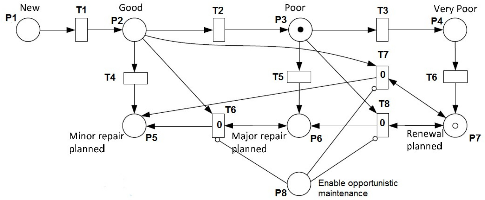 В работах Andrews J., Le B. и др. предложен ряд моделей на базе стохастических временных сетей Петри [30–33]. Модель моста имеет иерархический характер и формируется из подмоделей каждого из компонентов моста. При этом учитывается как износ отдельных компонентов, так и зависимость между процессами износа взаимодействующих компонентов. Время между состояниями в результате ухудшения параметров и проведением технического обслуживания регулируется соответствующими распределениями Вейбулла. Модель сети Петри учитывает процессы деградации, инспекции и ремонта отдельных элементов моста при исследовании альтернативных стратегий обслуживания.
