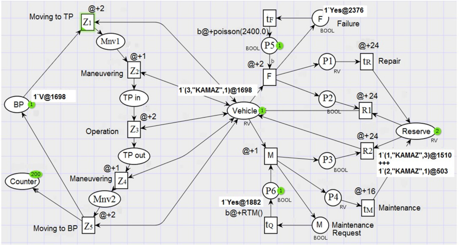 Анализ известных работ в области организации технического обслуживания и ремонта (ТОиР) показал, что в последний период времени все больше исследователей обращаются к моделям на сетях Петри [7–9]. Используются различные модификации сетей Петри, при этом наиболее эффективными являются временные раскрашенные сети Петри TCPN (Timed Colored Petri Nets) [10] .