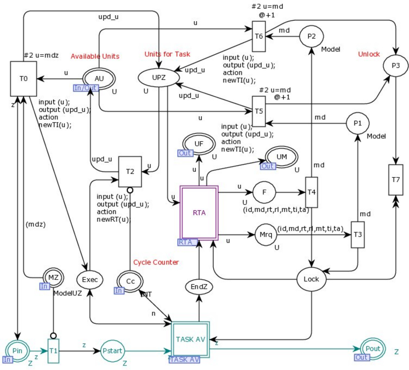 где – конечное множество позиций; – конечное множество переходов; – множество направленных дуг; – конечное непустое множество цветов; V – конечное множество типов переменных цветов, таких, что Type для всех , S: – это функция набора цветов для каждой позиции, G: T → EXPRT – функция условий, которая назначает условия для срабатывания каждому переходу, так, что Type [G (t)] = Bool, E: A→EXPRA – функция, которая присваивает каждой дуге некоторое выражение EXPRA, I: P→EXPRP – это функция инициализации, которая назначает выражение инициализации EXPRP каждой позиции p, такое, что Type [I (p)] = C (p), μ: P→N – маркировка сети, задающая количество фишек (маркеров) в позициях.