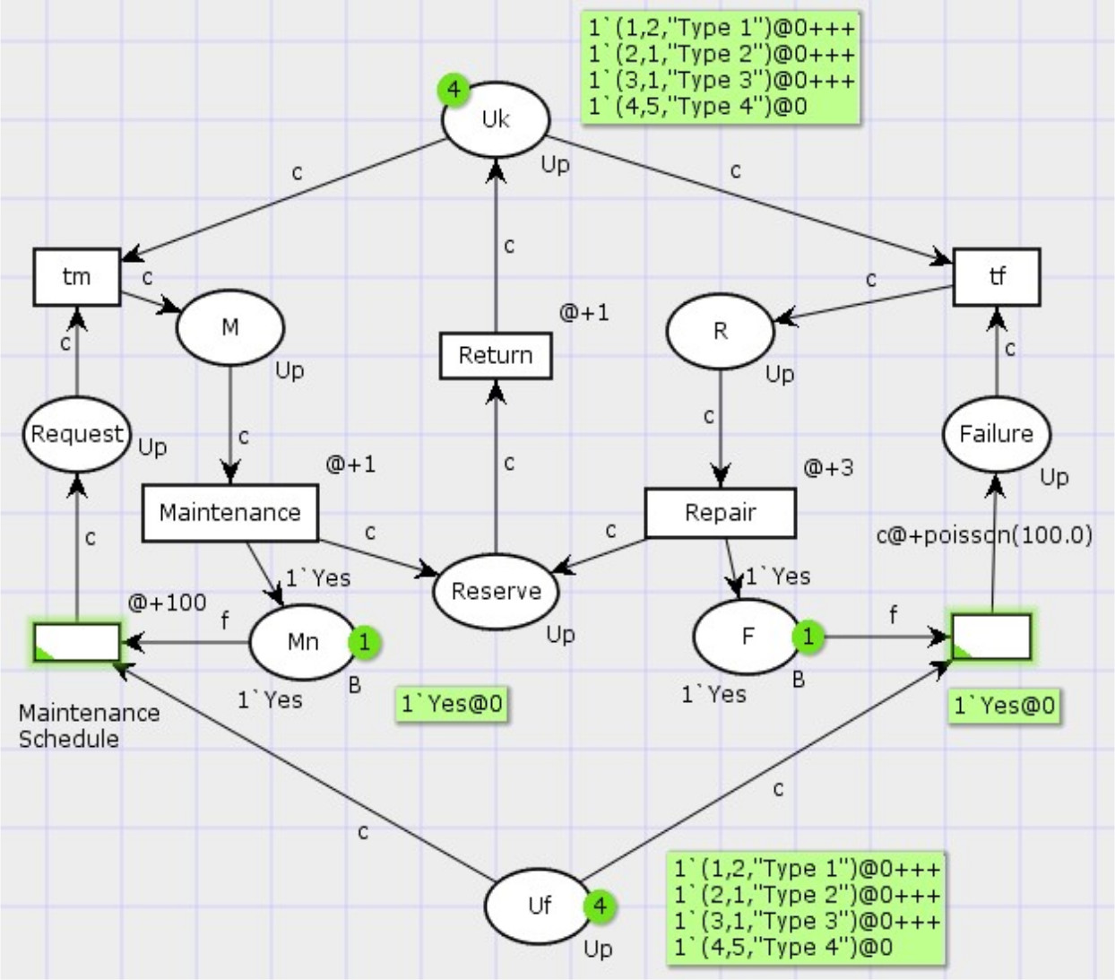 Позиция Uk содержит цветные фишки, соответствующие используемым компьютерам определенных типов: «Инженерный», «Графическая рабочая станция», «Офисный», «Сервер». Левая часть сети имитирует запросы на прогнозное техническое обслуживание и вывод компьютера на ТО из эксплуатации, правая часть сети описывает появление отказов и вывод компьютеров на ремонт. Позиция Reserve содержит множество компьютеров, прошедших ТО или ремонт.