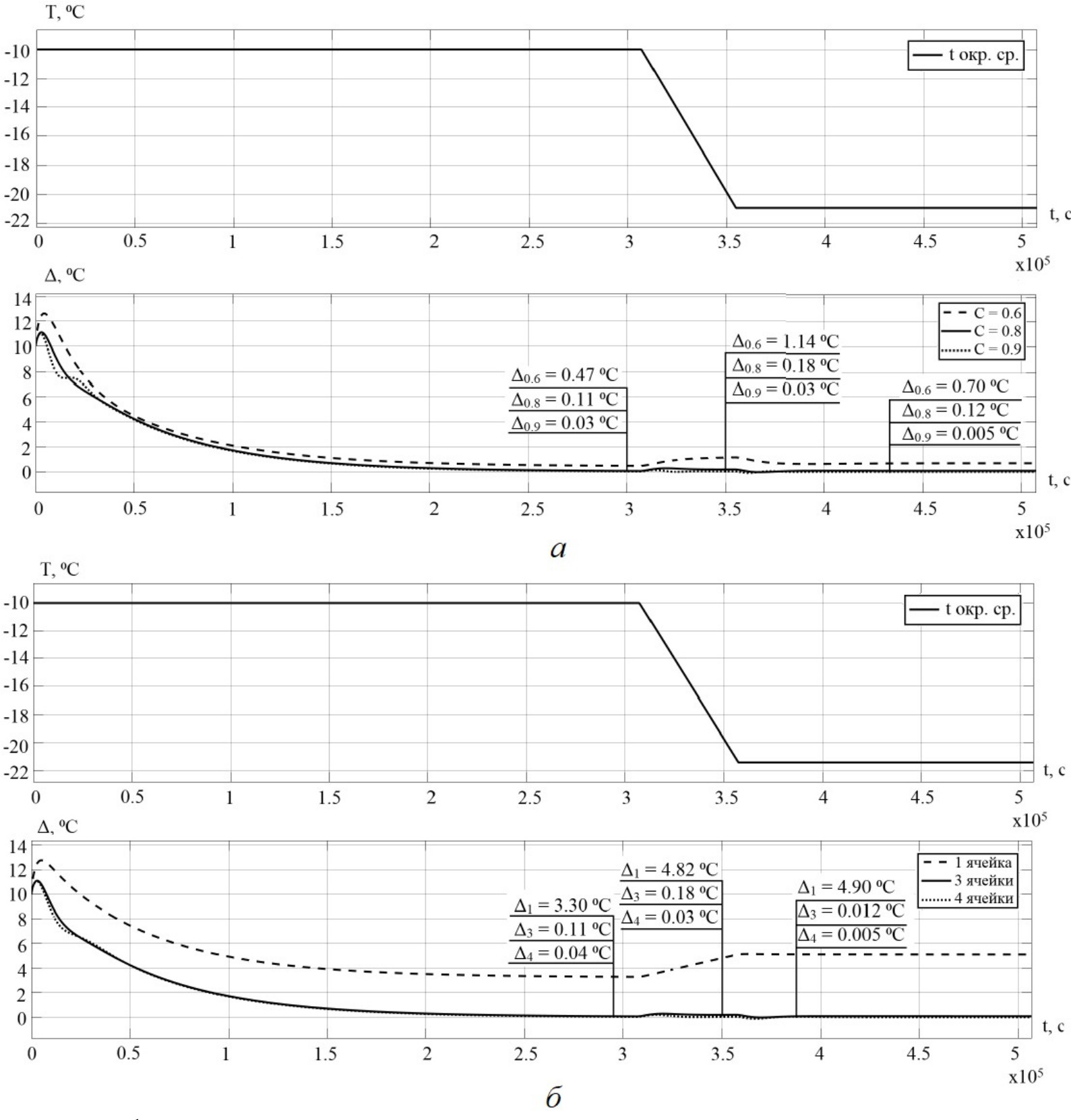 Рис. 7. График отклонения температуры поверхности утеплителя при варьировании коэффициента C в периодической структуре (а), график отклонения температуры поверхности утеплителя при варьировании количества ячеек в периодической структуре (б)