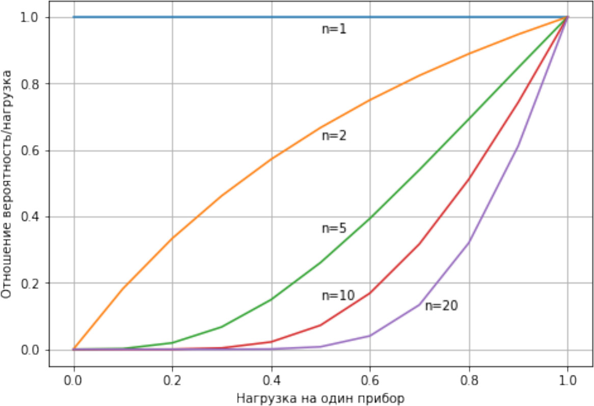 Из рис. 4 следует, что даже небольшое число каналов при пуассоновском входном потоке обеспечивает существенное уменьшение средней длины очереди по сравнению с одноканальной системой. С увеличением числа каналов (приборов обслуживания) для пуассоновских потоков наблюдается существенное уменьшение размеров очередей.