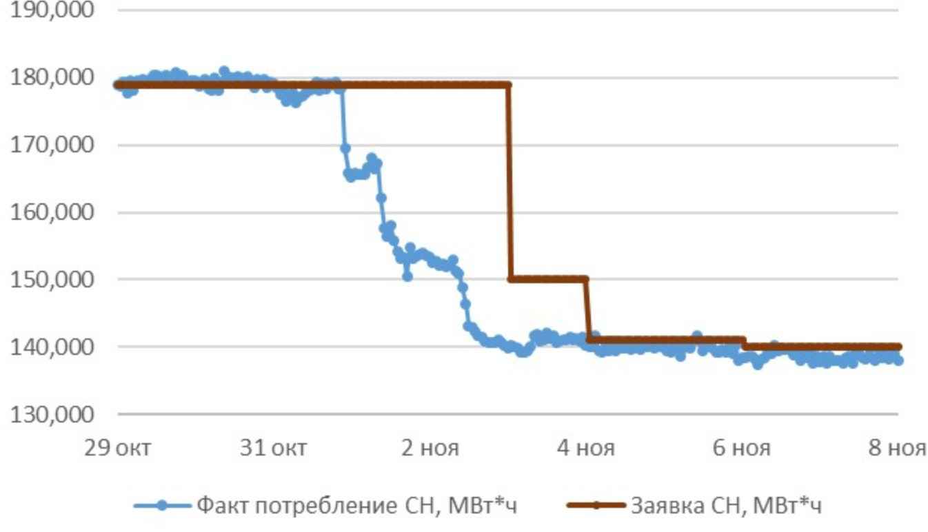 Рис. 3. Часть графика, отражающего фактические и прогнозные значения электропотребления системой СН АЭС за октябрь – ноябрь 2020 года