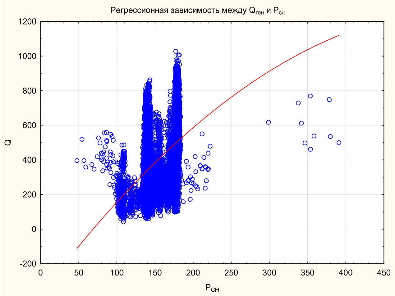 Рис. 5. Регрессионная зависимость между Qген и Pсн