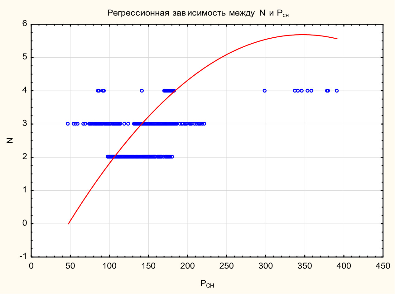 Рис. 6. Регрессионная зависимость между количеством блоков в работе N и Pсн