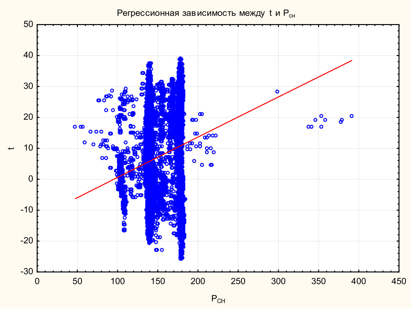 Рис. 7. Регрессионная зависимость между температурой наружного воздуха t и Pсн