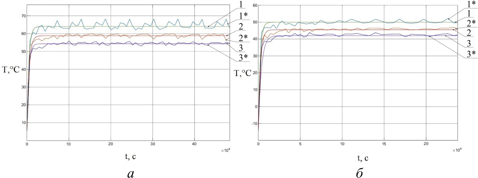 Рис. 6. Аппроксимация влияния длительной работы котлов на изменение температурного поля в точках E (а) и F (б). Здесь 1 и 1*, 2 и 2*, 3 и 3* – данные с модели SolidWorks и результаты аппроксимации при индивидуальной работе котлов Кт1, Кт2, Кт3 соответственно