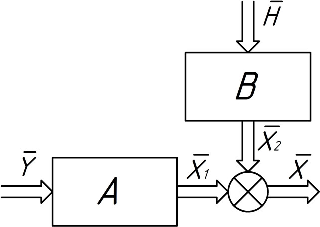 В результате проведенных исследований математическая модель удаления продуктов сгорания в трубе дымохода может быть представлена в виде матричной структуры многомерного объекта (рис. 9) [20]. Здесь – векторы управляющих, возмущающих и выходных координат, где = [Q1,Q2]T, = [Qk1, Qk2, Qk3, Tc]T, = [TF,TE]T; A и B – операторы объекта управления по отношению к векторам и .