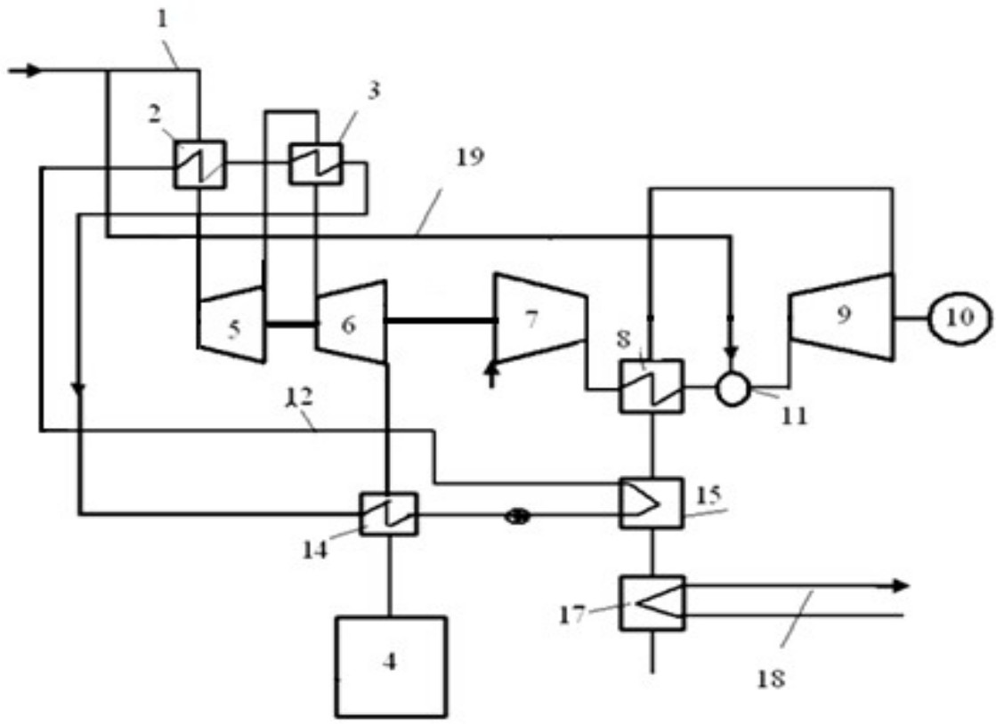 Рис. 11. Схема трехвальной энергетической КГТДУ в составе ТЭЦ: 1 – газопровод высокого давления 1,2 Мпа; 2 – теплообменный аппарат ПГ; 3 – теплообменный аппарат ПГ; 4 – котельный агрегат; 5 – турбодетандер высокого давления; 6 – турбодетандер низкого давления; 7 – компрессор низкого давления; 8 – теплообменный аппарат КГТДЭУ; 9 – газовая турбина; 10 – электрогенератор; 11 – камера сгорания КГТДЭУ; 12 – трубопровод горячего теплоносителя; 13 – компрессор высокого давления; 14 – теплообменный аппарат топливного газа КУ; 15 – газоводяной утилизационный теплообменник; 16 –турбина компрессора высокого давления; 17 – теплообменный аппарат подогрева сетевой воды; 18 – трубопроводы сетевой воды теплосети; 19 – турбина компрессора высокого давления