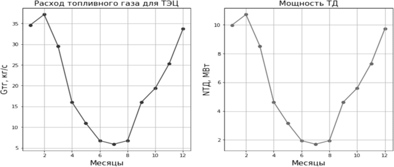 На рис. 2 показано изменение расхода топливного газа GГРП по месяцам года для ТЭЦ с номинальной мощностью 450 МВт. В зависимости от времени года, величин электрической и тепловой нагрузок ТЭЦ расход топливного газа, подаваемого ГРС, изменяется от 5 до 37 кг/с.