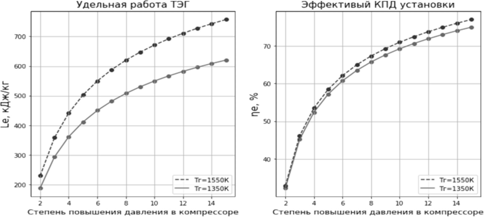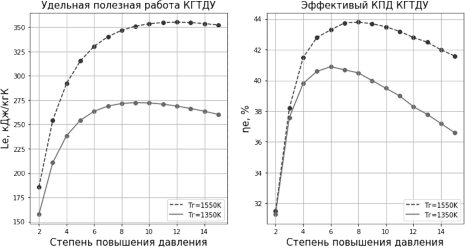 При температуре TГ = 1350 К перед Т9 максимальные значения эффективного КПД получаются при степени повышения давления в компрессоре πК7 = 6, удельной полезной работы КГТДУ – при πК7 = 9. При температуре TГ = 1550 К максимальные значения эффективного КПД – при πК7 = 8, удельной полезной работы КГТДУ – при πК7 = 12. По величине с ростом температуры ТГ параметры эффективности увеличиваются в среднем от 7 до 30 %.