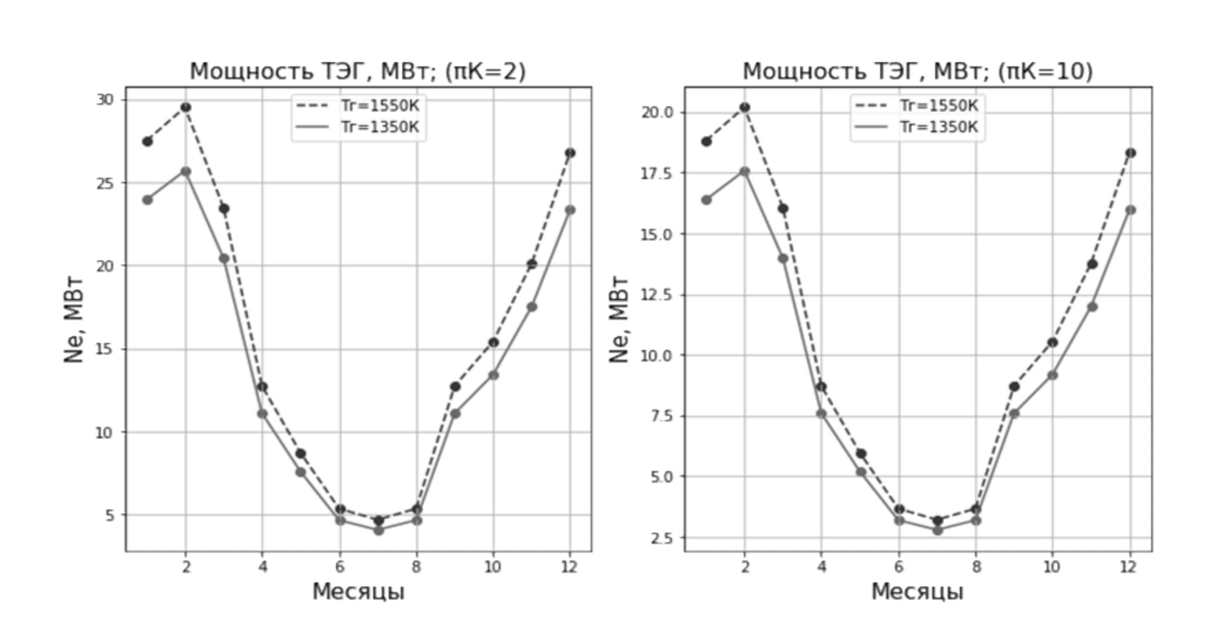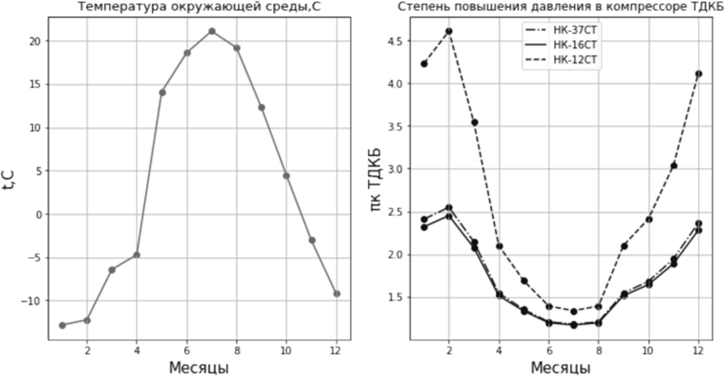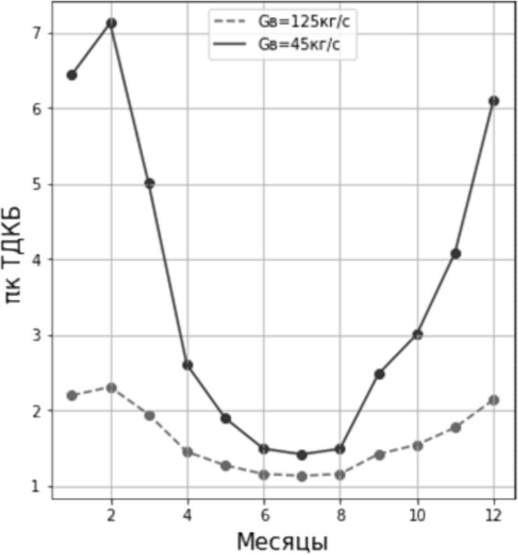 С учетом производительности ТЭЦ, температуры окружающей среды по месяцам года и расхода воздуха через ГТУ GB была рассчитана располагаемая степень повышения давления в компрессоре 7 (рис. 14).