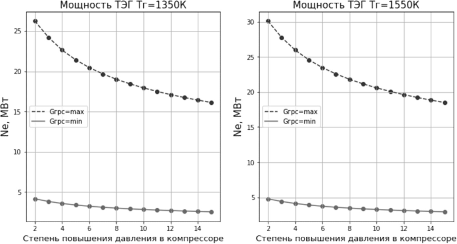 Для температуры газа перед турбиной TГ = 1350 К и TГ = 1550 К для степени повышения давления и в диапазоне расхода природного газа через ТЭЦ построены графические зависимости изменения мощности турбины электрогенератора (рис. 5).