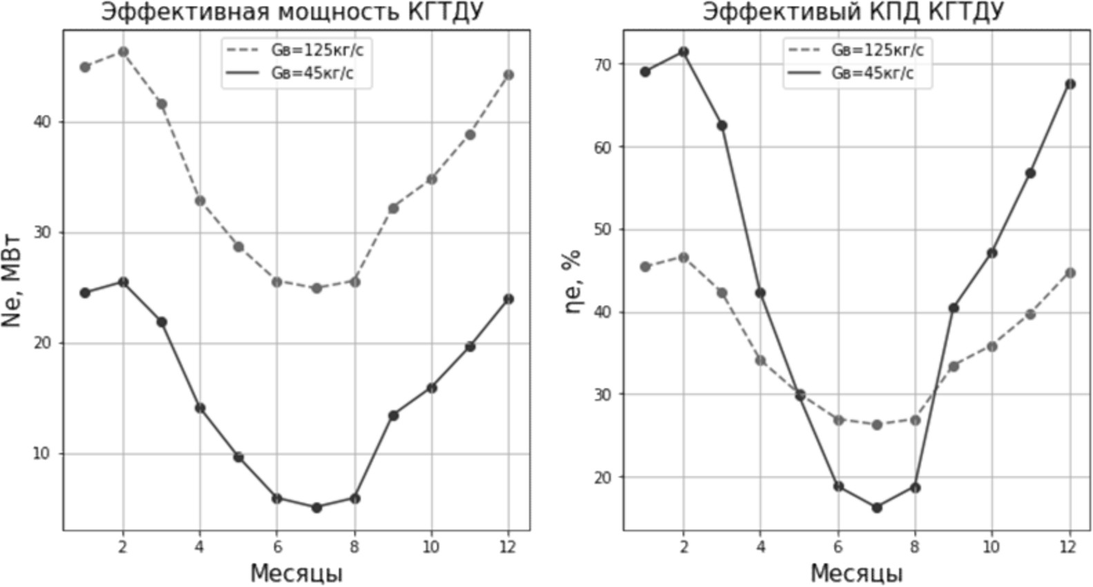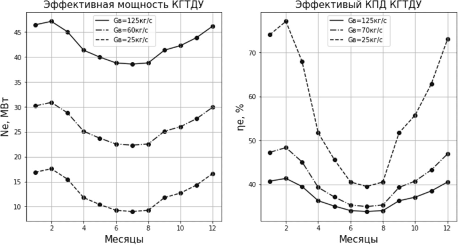 Во всем диапазоне располагаемой мощности газовых турбодетандеров расход воздуха через компрессор изменяется в зимний период от 140 до 25 кг/с и в летний период от 30 до 5 кг/с. С ростом степени повышения давления в воздушном компрессоре расход воздуха снижается. Следовательно, на электрическую мощность КГТДКУ влияние оказывает расход природного газа через ТЭЦ, и усиливает это влияние зависимость параметров воздушного компрессора от расхода газа через ТЭЦ.