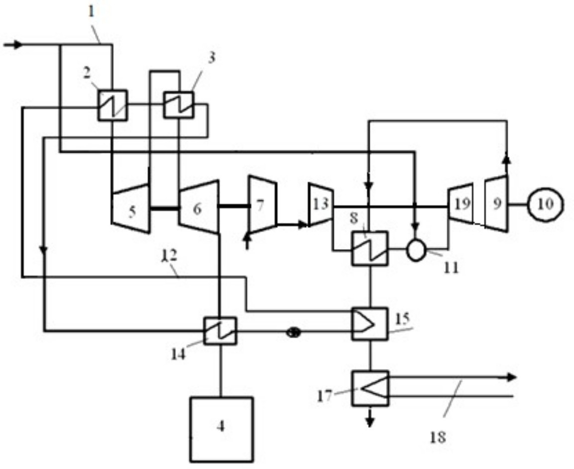 Газ с давлением 1,2 МПа подогревают в теплообменном аппарате (ТА) 2 теплом теплоносителя от TвхТД5 =100 °С, расширяют в ТД высокого давления 2 до давления 0,5–0,6 МПа, подогревают в ТА низкого давления 3 TвхТД5 = 80°С, расширяют в ТД низкого давления 6 до 0,12–0,125 МПа, подогревают теплоносителем в ТА подогрева газа 14 до температуры 40–50 °С и подают в блок регулирования топливного газа для горелок котельных агрегатов ТЭЦ 4. Теплоноситель для ТА 2, 3 и 14 нагревают в утилизационном ТА 15 теплом уходящих газов после расширения в газовой турбине 9. Далее после ТА 15 теплом выхлопных газов подогревают сетевую воду теплосети в ТА подогрева сетевой воды 17.