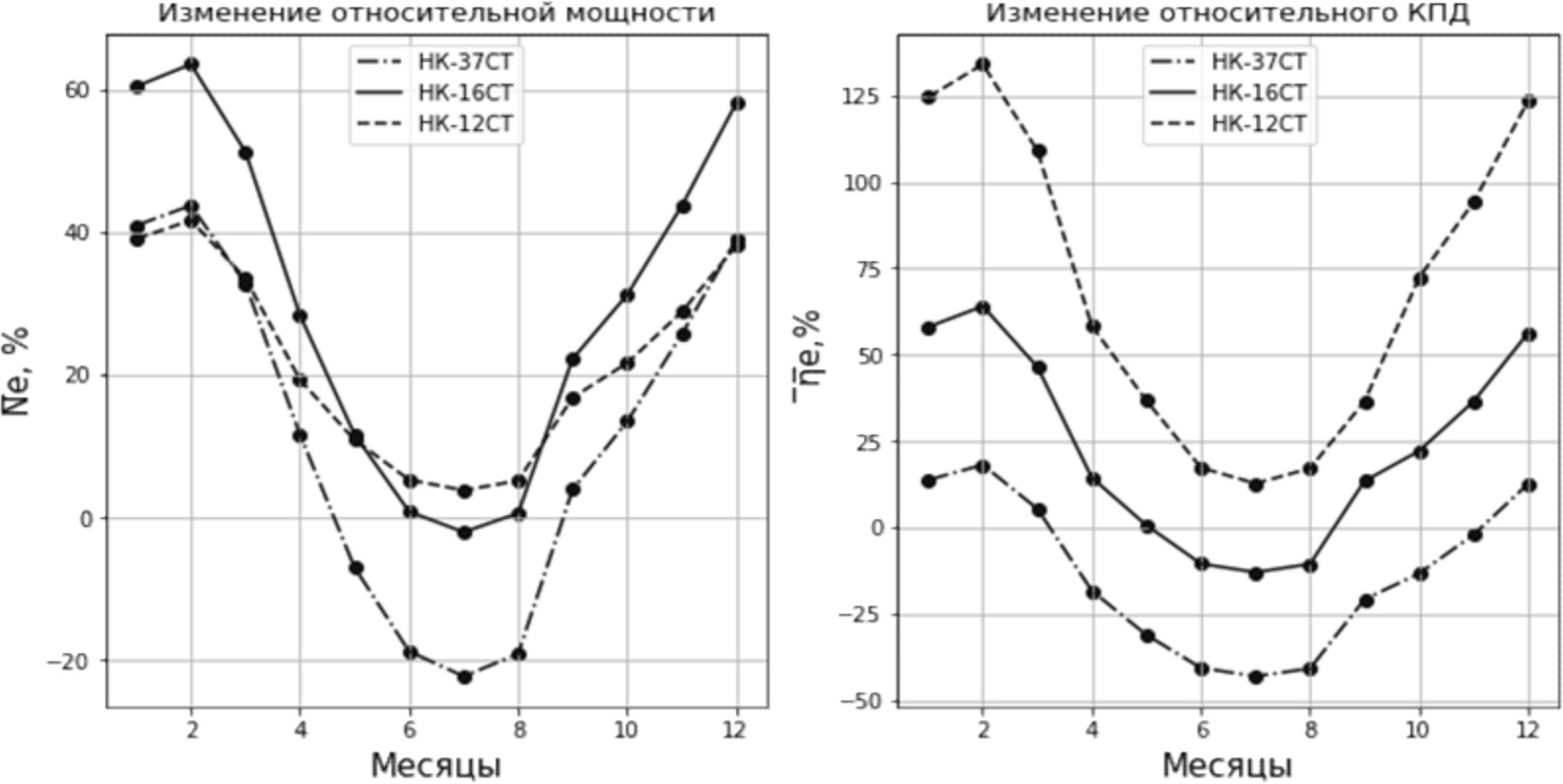Для установки НК-37СТ прирост эффективности наблюдается только в зимний период с наибольшими расходами топливного газа. Увеличения мощности можно достигнуть до 40 %, увеличения КПД – порядка 20 % (эти значения характерны только для заданных параметров ТЭЦ в зимний период). При снижении расхода топливного газа снижается суммарная степень повышения в компрессоре ГТУ и параметры эффективности существенно ухудшаются относительно базовой установки НК-37СТ.