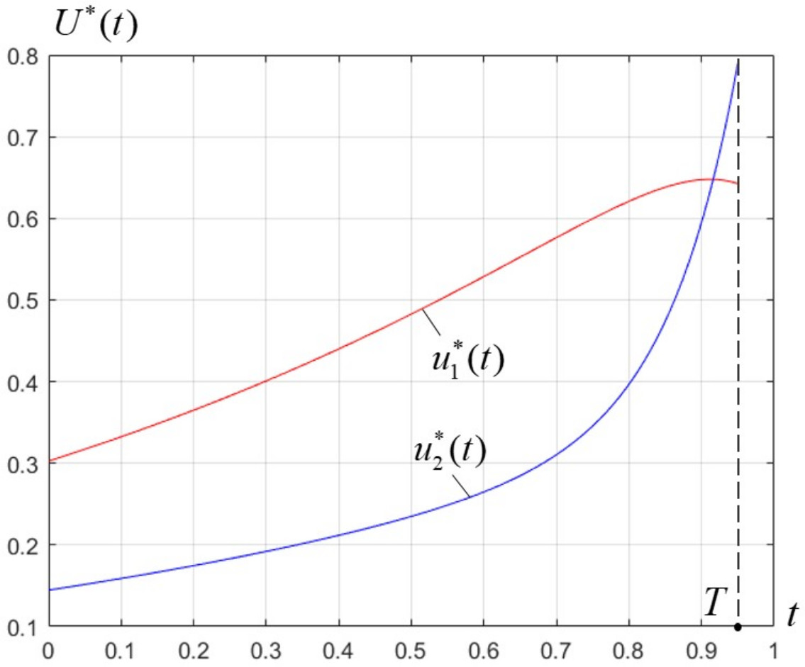 Рис. 2. Программные оптимальные управления, построенные по (17) с найденными значениями сопряженных переменных: , , ,