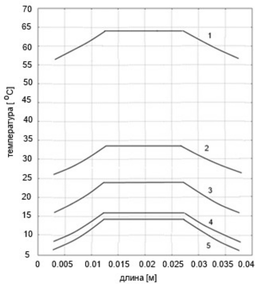Рис. 1. Диаграммы температуры вдоль горизонтальной осевой линии провода при коэффициенте конвективного теплообмена: 1 – 5 Вт/(м2 град) ; 2 – 10 Вт/(м2 град) ; 3 – 15 Вт/(м2 град) ; 4 – 20 Вт/(м2 град) ; 5 – 25 Вт/(м2 град)