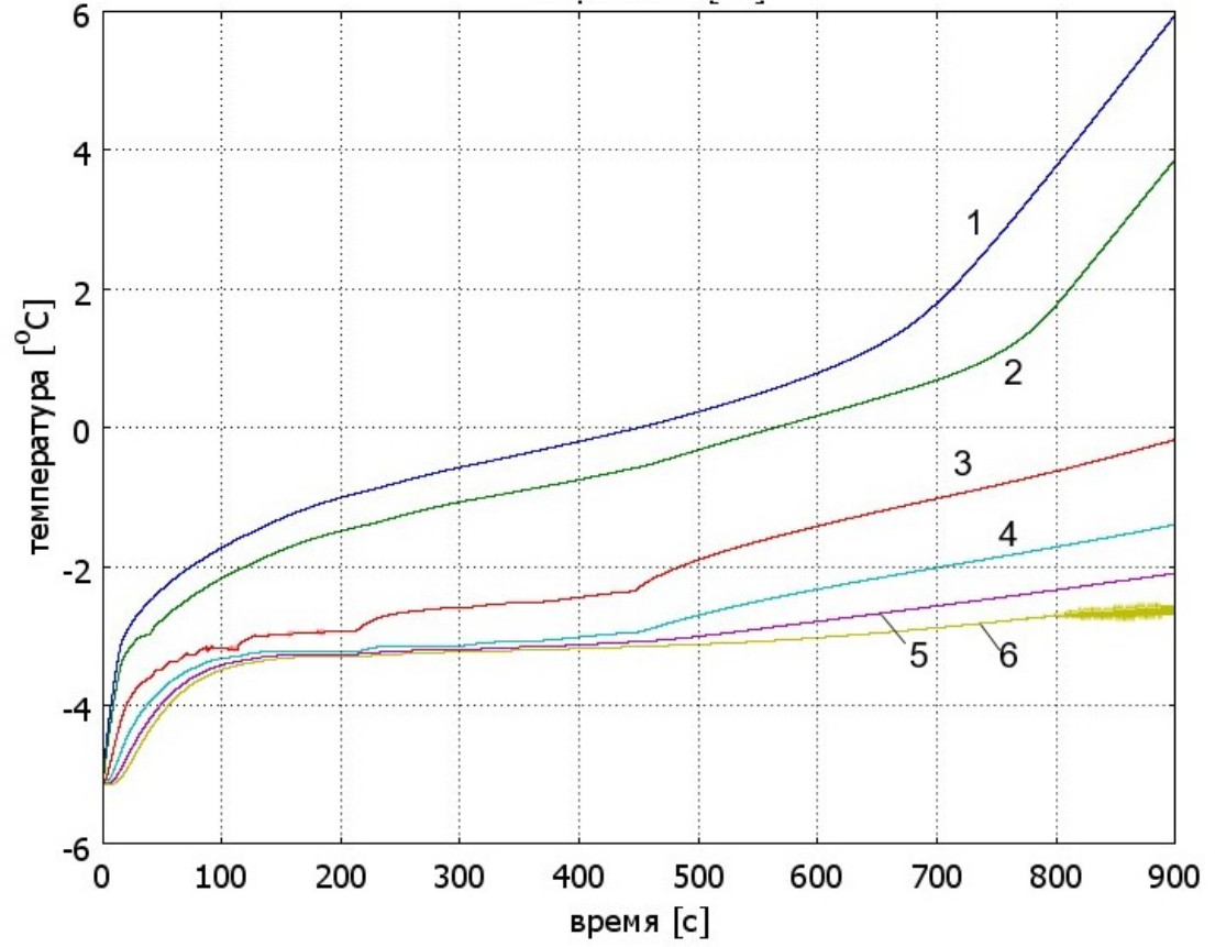 Рис. 5. Временные диаграммы температуры в оболочке на расстоянии от поверхности провода: 1 – 0 мм; 2 – 0,5 мм; 3 – 2,5 мм; 4 – 4,5 мм; 5 – 6,5 мм; 6 – 10 мм