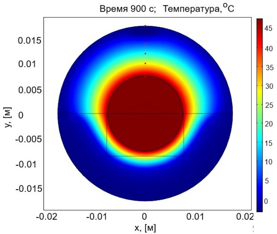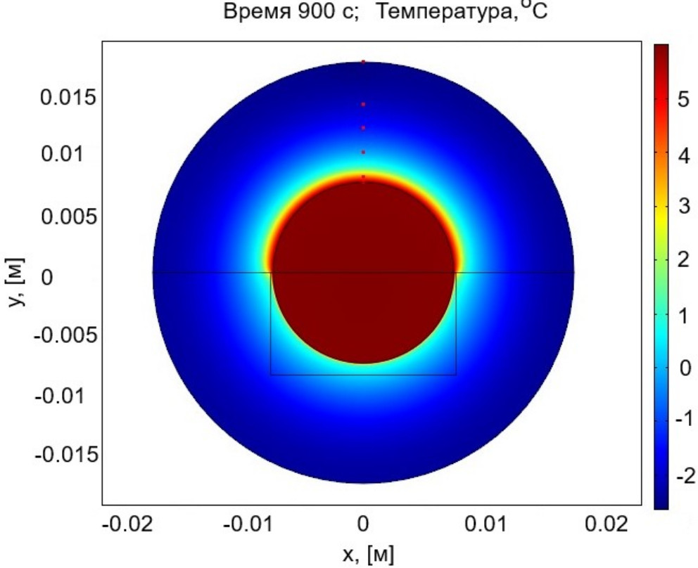 На рис. 3 изображено распределение температуры в проводнике и в слое льда в момент времени 900 с. Несимметрия в картине распределения незначительна.