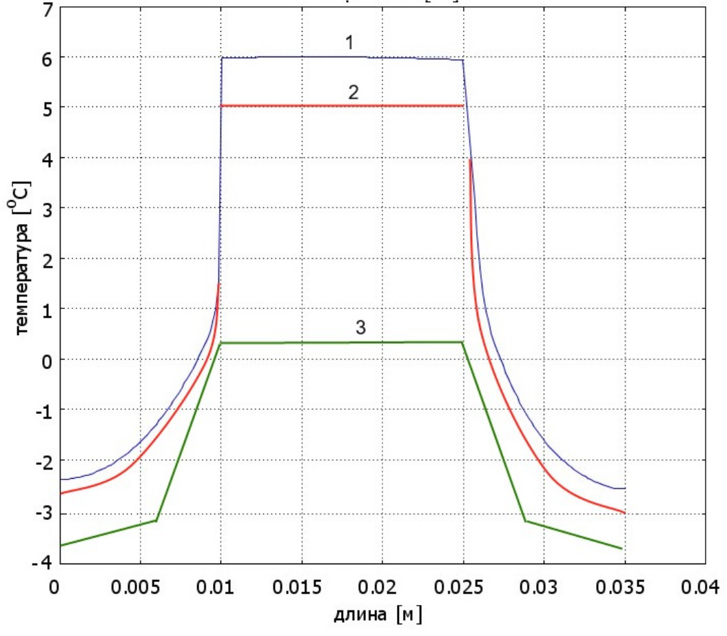 Рис. 7. Диаграммы температуры в проводе с ледяной (рыхлой) оболочкой при коэффициенте теплообмена: 1 – 5 Вт/(м2 град) ; 2 – 25 Вт/(м2 град) ; 3 – 125 Вт/(м2 град)