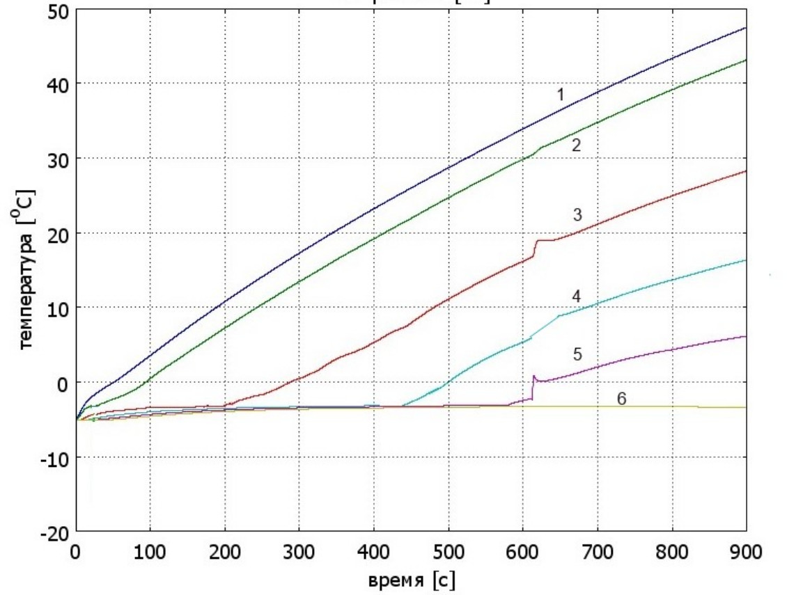 Согласно диаграммам, приведенным на рис. 5, температура водно-ледяной оболочки на расстоянии 6,5 мм от поверхности провода становится выше нуля через 650 с. Таким образом, время перемещения нагретого провода через комбинированную водно-ледяную оболочку снижается в несколько раз (положительные температуры соответствуют жидкой фазе). Мощность тепловыделения при заданных параметрах теплообмена с окружающей средой можно снизить еще больше.