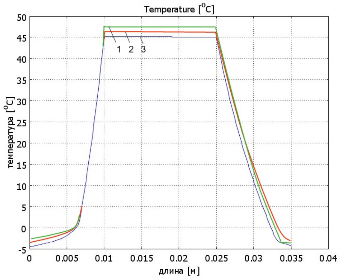 Рис. 4. Диаграммы температуры по высоте в проводе с оболочкой при коэффициенте теплообмена: 1 – 5 Вт/(м2 град) ; 2 – 25 Вт/(м2 град) ; 3 – 125 Вт/(м2 град)