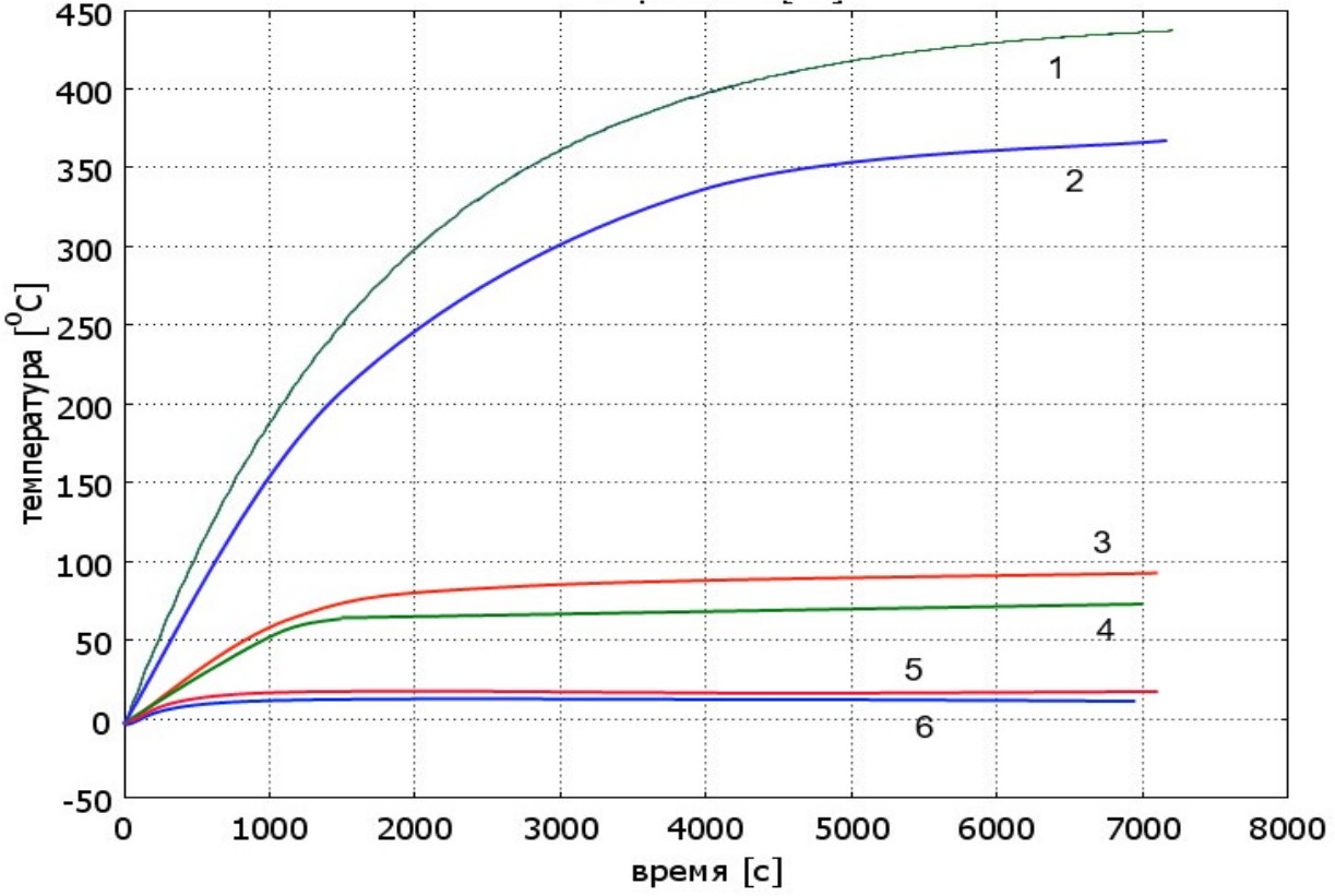 Рис. 8. Временные диаграммы температуры провода без ледяной корки: 1 – мощность 106 Вт, коэффициент теплообмена 5 Вт/(м2 град) ; 2 – мощность 88 Вт, коэффициент теплообмена 5 Вт/(м2 град) ; 3 – мощность 106 Вт, коэффициент теплообмена 25 Вт/(м2 град) ; 4 – мощность 88 Вт, коэффициент теплообмена 25 Вт/(м2 град) ; 5 – мощность 106 Вт, коэффициент теплообмена 125 Вт/(м2 град) ; 6 – мощность 88 Вт, коэффициент теплообмена 125 Вт/(м2 град)