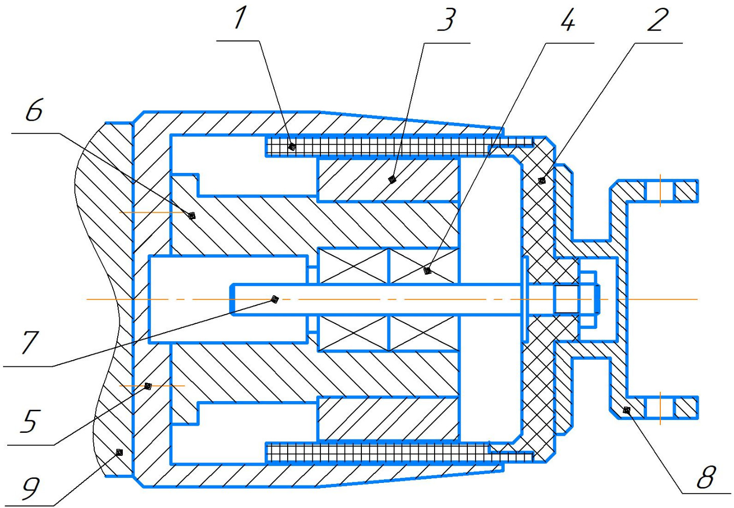 Рис. 1. Конструкция линейного двигателя постоянного тока: 1 – катушка якоря; 2 – основание якоря; 3 – магнит; 4 – линейный подшипник; 5 – наружный магнитопровод; 6 – внутренний магнитопровод; 7 – шток; 8 – крепление исполнительного механизма; 9 – основание платформы