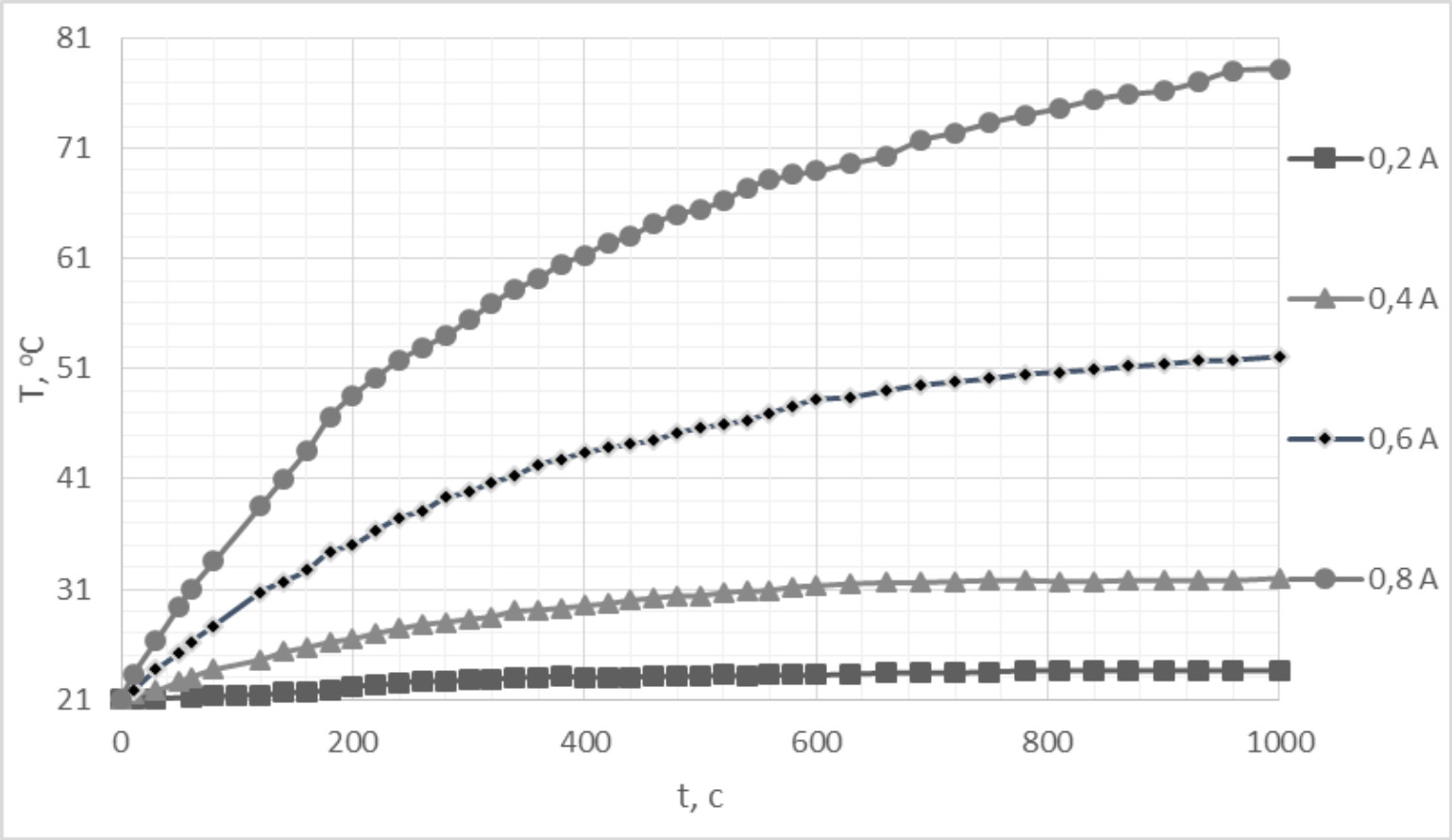 В ходе натурных испытаний опытного образца ЛДПТ были определены графики нагрева обмотки в функции времени для различных значений тока якоря (рис. 5). Эксперимент проводился для начальной температуры двигателя и окружающей среды 21 °С (294,1 К). Теплоемкость воздуха при изменении температуры от 21 до 40 °С практически не изменяется, поэтому будет корректным сравнение результатов моделирования и эксперимента по величине приращения температуры обмотки ΔTоб.