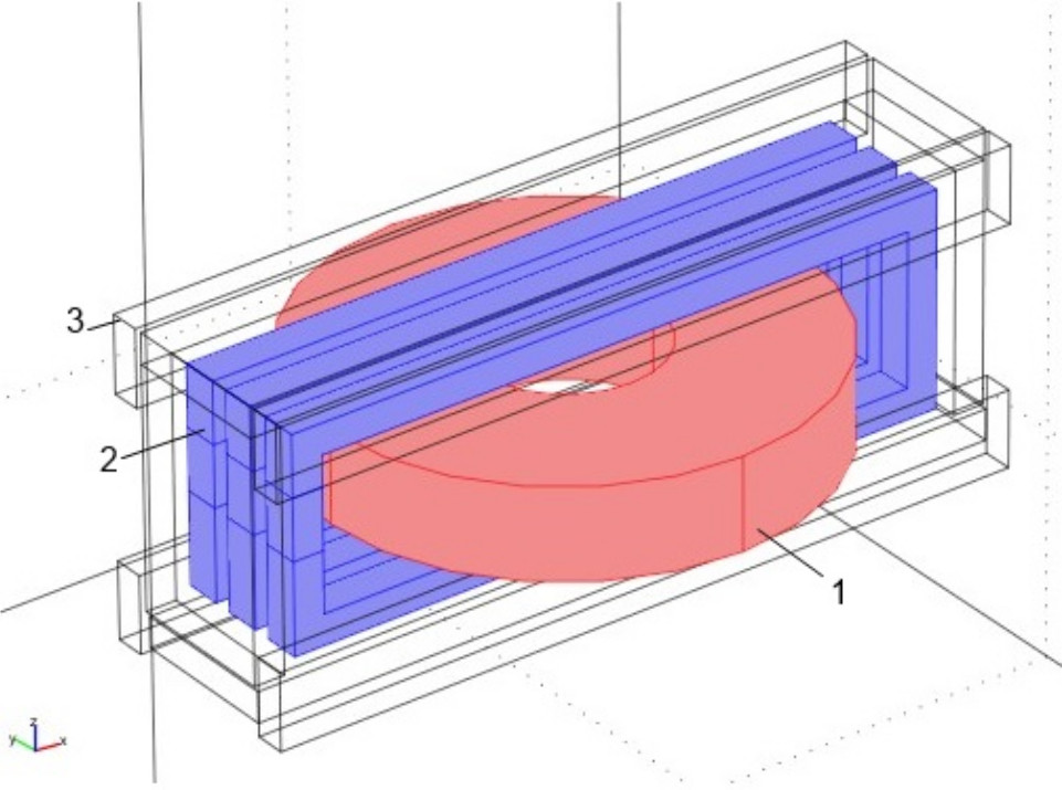 Рис. 1. Геометрическая модель индуктора с загрузкой: 1 – заготовка; 2 – проводники индуктора; 3 – пластины магнитопровода