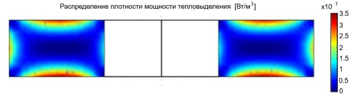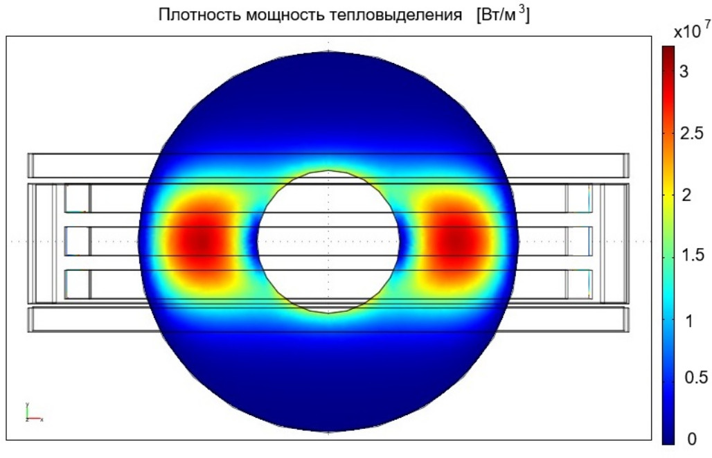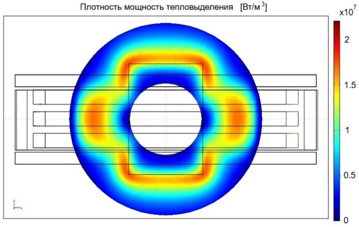 В результате проведенных расчетов получено приведенное на рис. 5 распределение плотности мощности на торцевой поверхности заготовки. Как видно из рисунка, область с мощностью тепловыделения смещена от отверстия в кольце. Аналогичные по виду распределения мощности наблюдаются по всей толщине кольца, подтверждая отсутствие тепловыделения во внутренних областях кольца, что свидетельствует о замыкании тока только по поверхности. Таким образом, выполнено одно из условий выравнивания распределения температуры во всем объеме заготовки – устранение зон с повышенным значением мощности тепловыделения.
