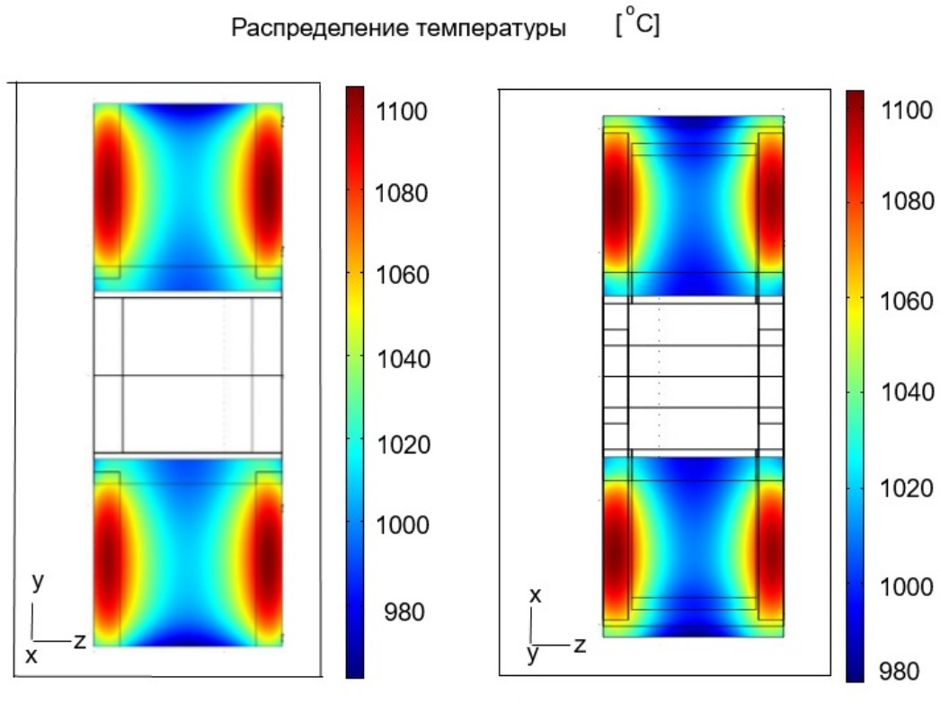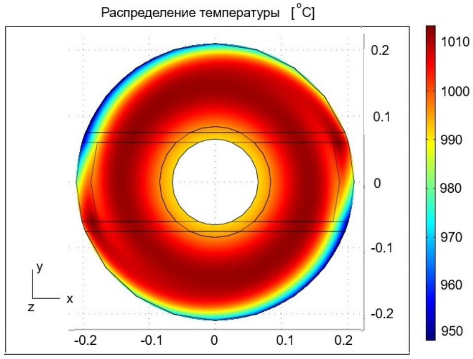 Приведенные на рис. 8 распределения температуры получены при неизменной во времени мощности тепловыделения. Использование системы регулирования температуры при контроле точки на боковой поверхности позволяет выровнять распределение до соответствия заданным требованиям. Полученное отклонение температуры в пределах всего объема кольца не превышает 5 %. Нужно учитывать, что достигнутый диапазон температур, равный 100 ºC, в системе управления преобразуется в отклонение от среднего значения. При заданном значении температуры, равном 1050 ºC, отклонение для распределения, представленного на рис. 8, составляет ºC.