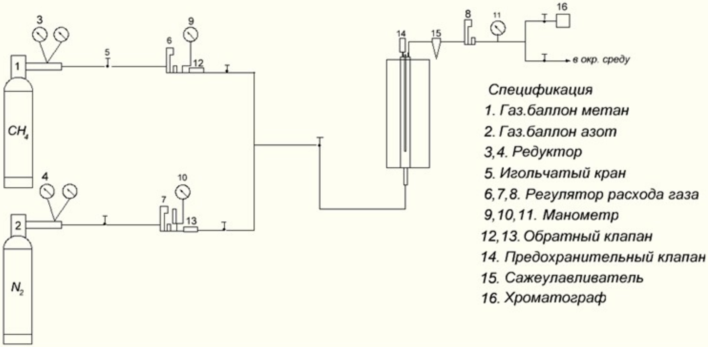 В ходе экспериментального исследования, проведенного с использованием специализированной аппаратуры, был осуществлен сбор данных функционирования установки с использованием разных катализаторов при различных технологических условиях. На рис. 1 представлена схема лабораторной установки каталитического пиролиза метана [17].