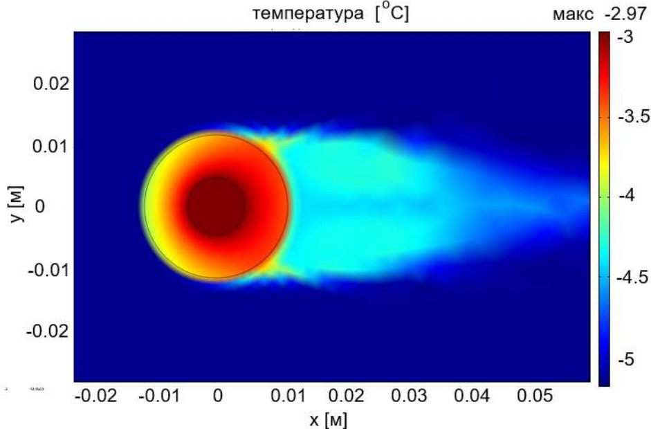 Коэффициенты конвективного теплообмена, найденные тремя способами, существенно отличаются друг от друга. Для более точного представления о характеристиках реального процесса теплообмена нужен физический эксперимент. Однако учитывая геометрические размеры провода и ледяной оболочки, сложно обеспечить качественный результат без возможности искажения тепловых процессов вносимыми датчиками в ледяную оболочку малой толщины. Кроме того, отдельная проблема заключается в процедуре настройки модели гидродинамики. Картина распределения температуры возле провода с ледяной оболочкой свидетельствует о затухании вихревых процессов на небольшом расстоянии, как и было предусмотрено в настройках модели. Однако известные проблемы используемой (k-ε)-модели турбулентности, связанные с поведением потока жидкости (газа) возле поверхности, до конца не преодолены.