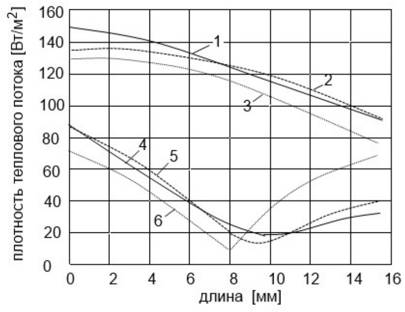 Рис. 4. Диаграммы плотности теплового потока на поверхности провода: левая верхняя дуга: 1 − при скорости 1 м/c; 2 − при скорости 5 м/c; 3 − при скорости 10 м/c; правая верхняя дуга: 4 − при скорости 1 м/c; 5 − при скорости 5 м/c; 3 − при скорости 10 м/c