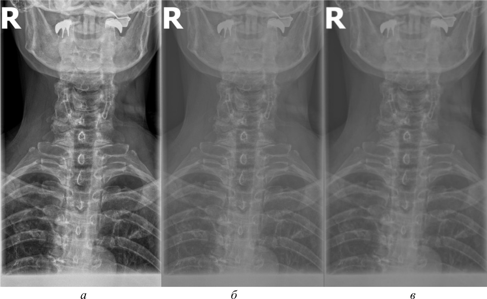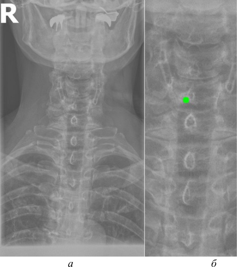 Автоматизированное распознавание таких ключевых анатомических ориентиров на рентгеновских изображениях представляет собой важную задачу, решение которой может повысить точность и скорость медицинской диагностики, обеспечив врачей объективной информацией для принятия решений. Компьютерное зрение способно автоматически локализовывать и идентифицировать анатомические структуры, измерять их размеры и взаимное расположение, а также выявлять отклонения от нормы, указывающие на наличие патологий. Однако недостаточное качество рентгеновских снимков, наличие помех, артефактов и неравномерностей может затруднять их восприятие системами компьютерного зрения. На рис. 1, а продемонстрирован рентгеновский снимок без предварительной обработки.