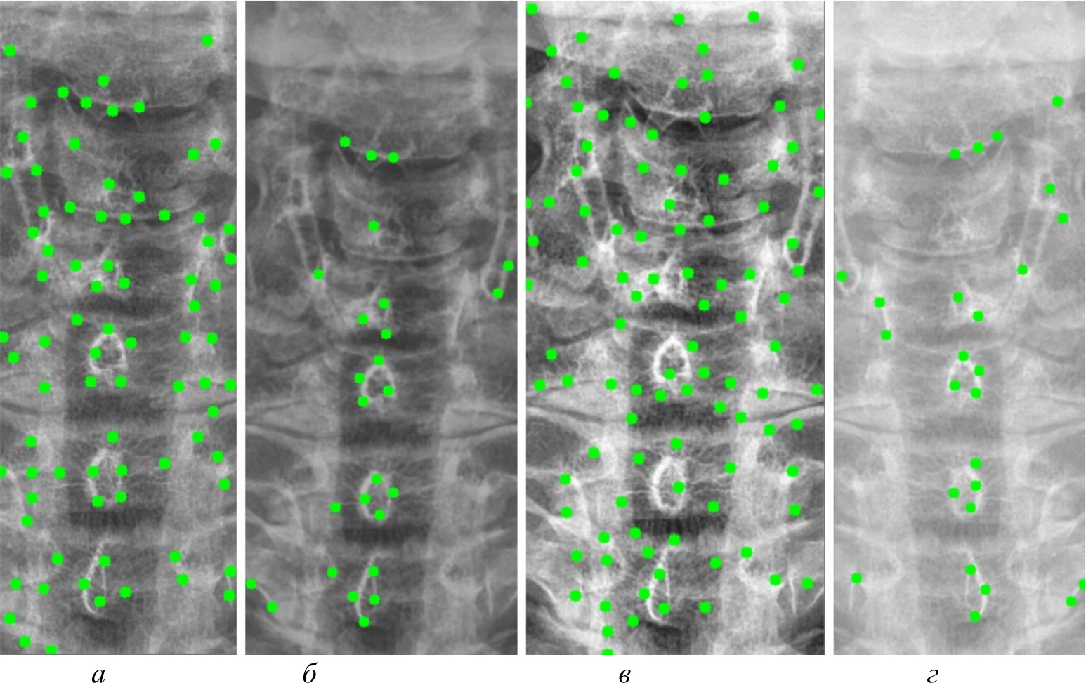 Как видно на рис. 1, б, применение алгоритмов компьютерного зрения на необработанном изображении приводит к нечетким и неустойчивым результатам обнаружения ключевых анатомических ориентиров. Тем самым важной задачей, обеспечивающей эффективное применение алгоритмов компьютерного зрения, является разработка эффективных алгоритмов предварительной обработки изображений. Данные предварительной обработки, такие как улучшение контраста и устранение артефактов, служат основой для более точного и надежного анализа с использованием алгоритмов компьютерного зрения. Это позволяет повысить качество обнаружения ключевых анатомических ориентиров, играющих критическую роль в идентификации и оценке патологических изменений.