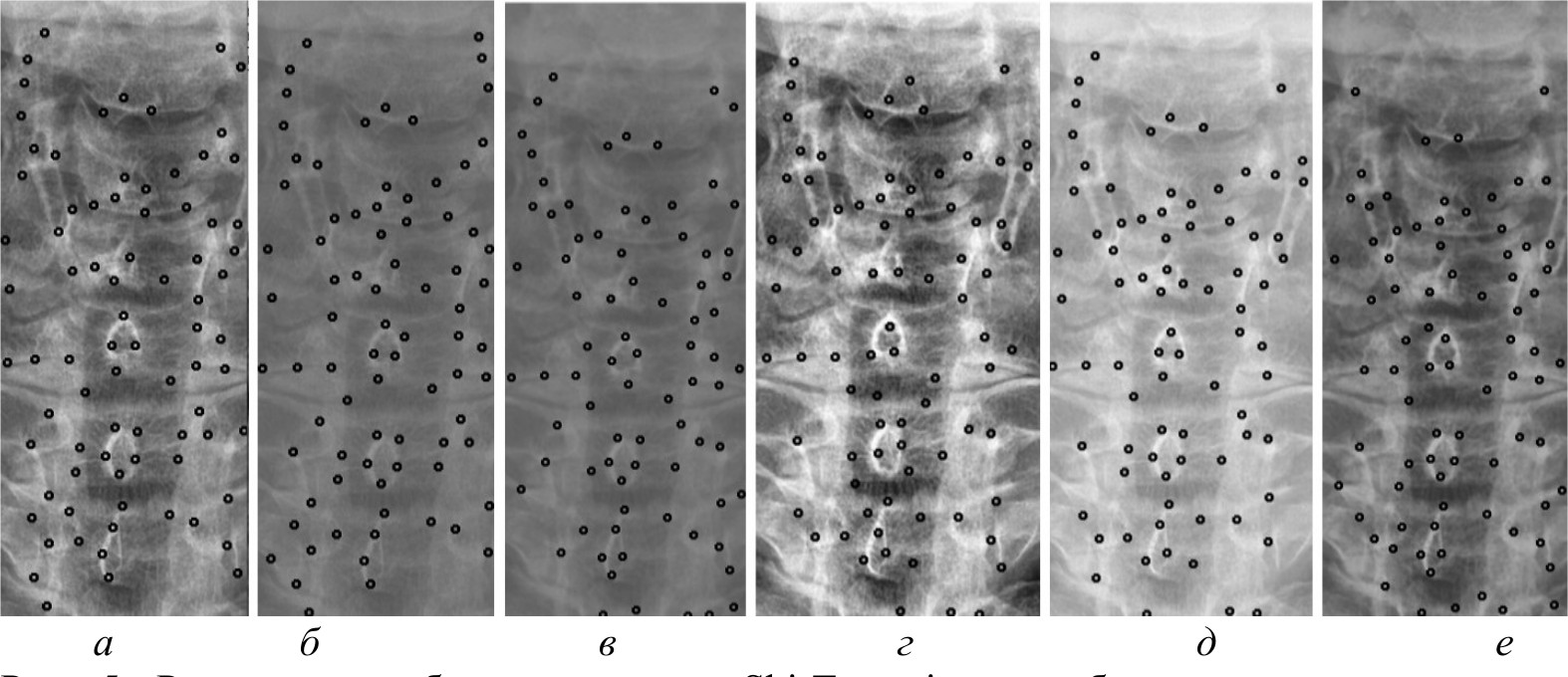 Рис. 5. Результаты работы алгоритма Shi-Tomasi на изображении, полученном при помощи специализированного программного обеспечения (а); результаты работы алгоритма Shi-Tomasi при методе базового отображения в Python (б); результаты работы алгоритма Shi-Tomasi при методе базового отображения Python с применением медианного фильтра (в); результаты работы алгоритма Shi-Tomasi при методе адаптивной эквализации гистограммы (г); результаты работы алгоритма Shi-Tomasi при методе стандартной эквализации гистограммы (д); результаты работы алгоритма Shi-Tomasi при методе гамма-коррекции (е)
