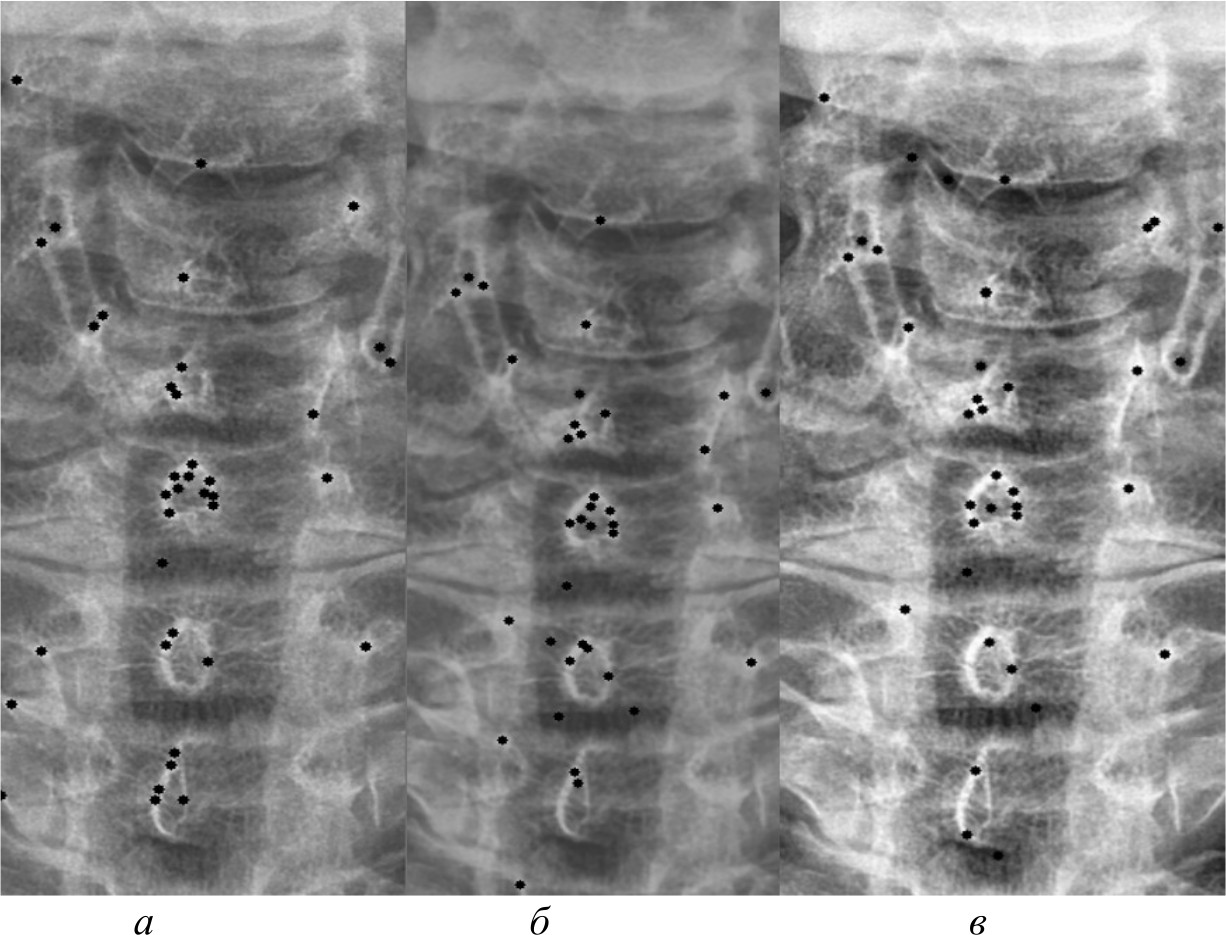 Рис. 6. Результаты работы алгоритма SIFT на изображении, полученном при помощи специализированного программного обеспечения (а); результаты работы алгоритма SIFT при методе адаптивной эквализации гистограммы (б); результаты работы алгоритма SIFT при методе стандартной эквализации гистограммы (в)