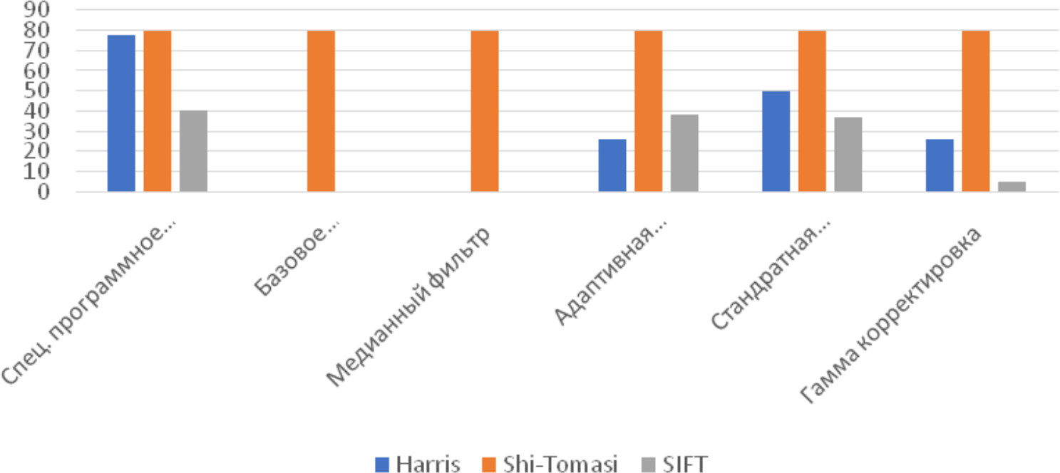 На рис. 4, 5 и 6 представлены результаты работы детектора Харриса, алгоритма Shi-Tomasi и SIFT при различных методах предварительной обработки изображений.